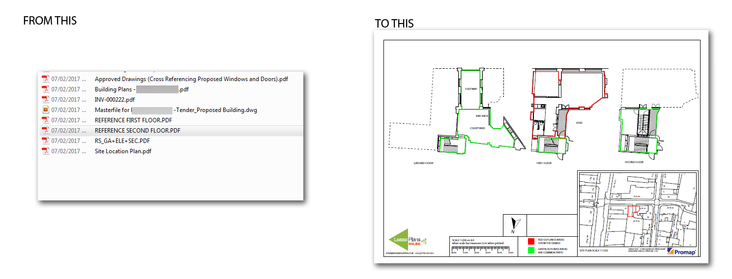 A lease plan is a scaled technical drawing which shows the parts of parts of property and land over which a leaseholder has exclusive or shared rights. A lease document will use words to describe the property and land and the Lease Plan will be a visual representation of these rights.